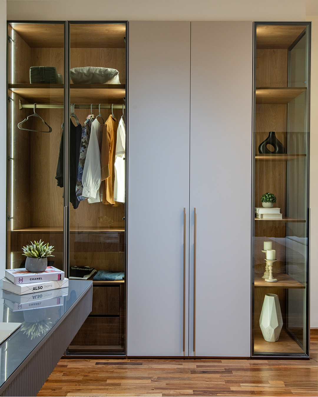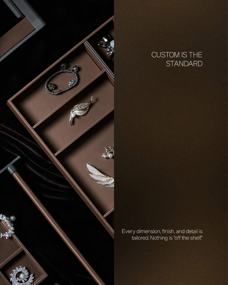 From glass and ceramic facades to leather panels, backlit surfaces, and bespoke metal detailing — every finish is selected for performance and visual restraint. Core structures are engineered for durability with plywood core strength. Metal elements are fabricated to specification.