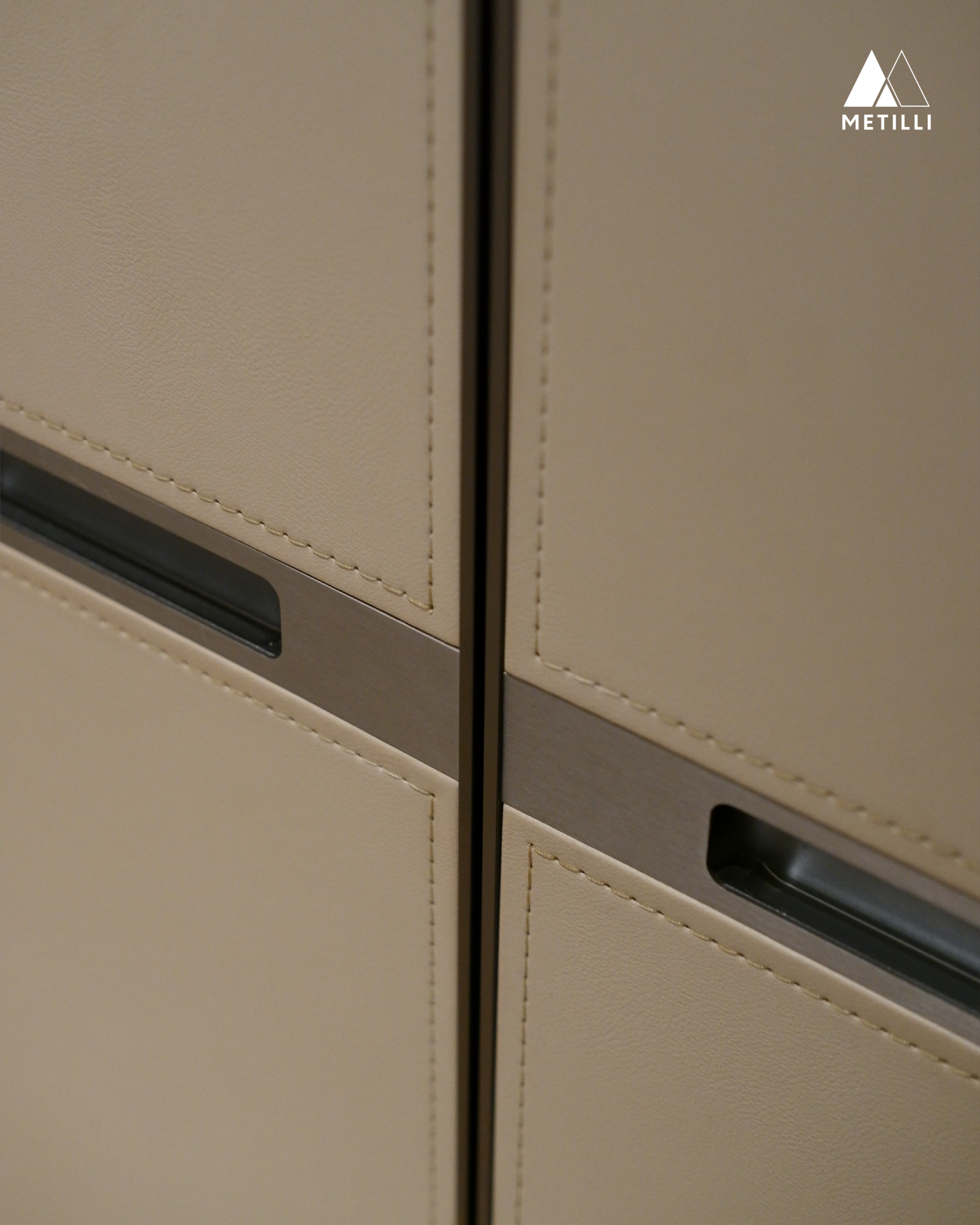 Applied over precision-built panels, leather finishes are carefully wrapped and aligned for clean edges and long-term durability.