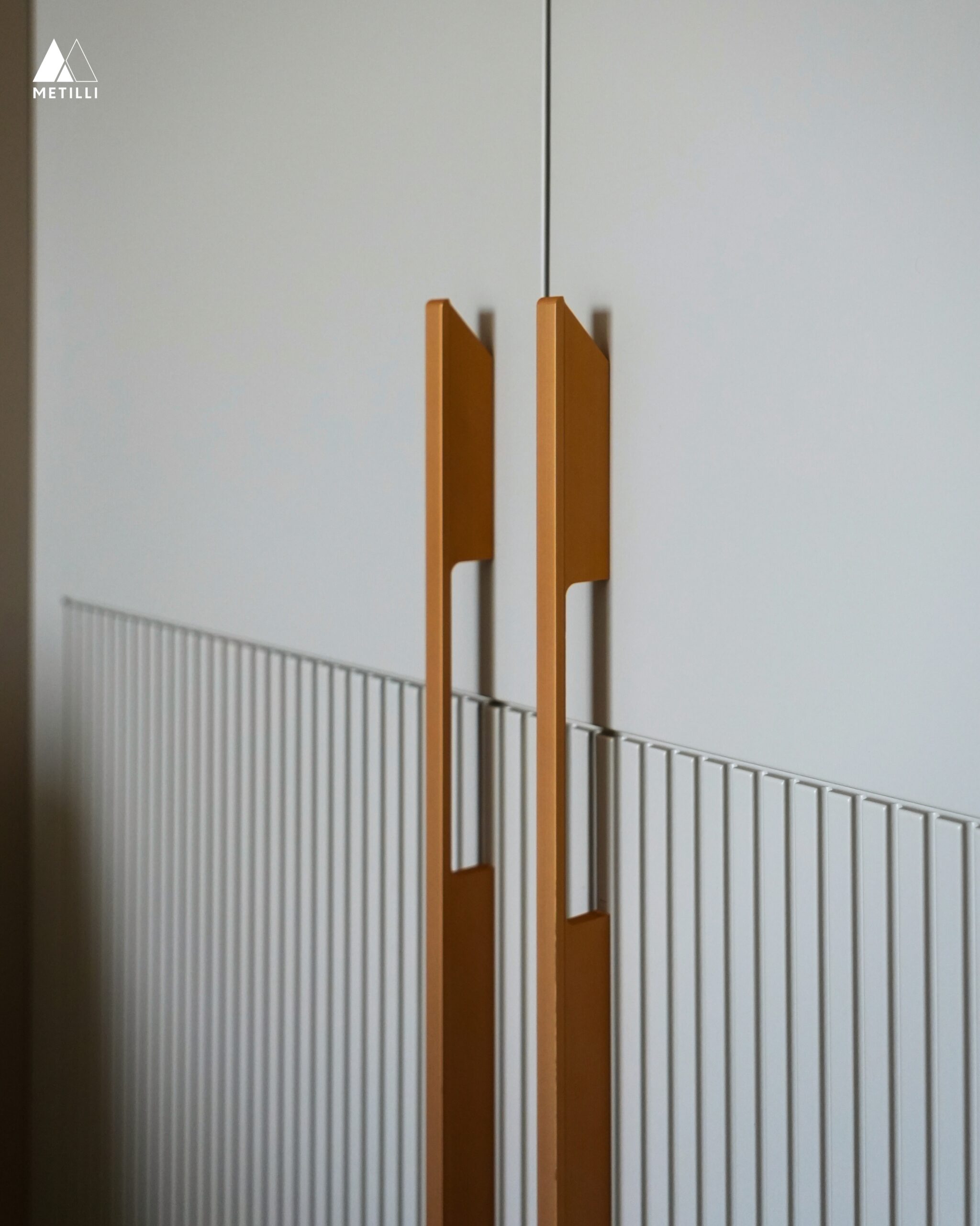 The material softens the visual mass of large wardrobes while adding a refined, understated character. Its matte texture reduces glare and creates a warm, tailored finish — especially suited to master suites and walk-in wardrobes.